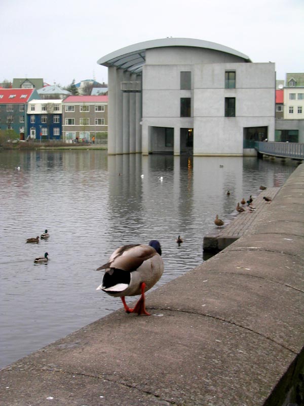 The ducks seem to like Reykjavík town hall. The city was much smaller than I expected! The whole country, geographically about the size of England (without the rest of the UK), has barely over a quarter million people, and 180,000 of them live in or around Reykjavík, the only real urban area in the country. The next largest town only has 15,000. When I first took the bus into Reykjavík from the hostel, I nearly went right past downtown as it didn't fit my conception of it. Everyone getting off was my big clue though and fortunately I followed them. |