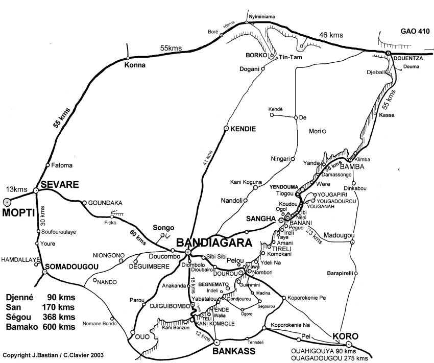 A map of the Pays Dogon, home of the Dogon people, near the border with Burkina Faso, and concentrated on the edge of the Bandiagara escarpment, which I discovered later is a UNESCO World Heritage site.