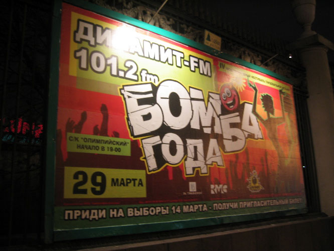 An ad for 'Bomba Goda' - a party exclusively for those who've voted in the 14th of March national elections. Putin is virtually guaranteed to win, but he needs a 50% turnout for it to count.