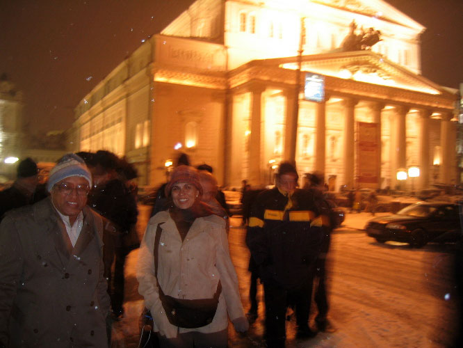 Two members of the WCRP, from Princeton (via southern India) and from Ecuador, in front of the Bolshoi.