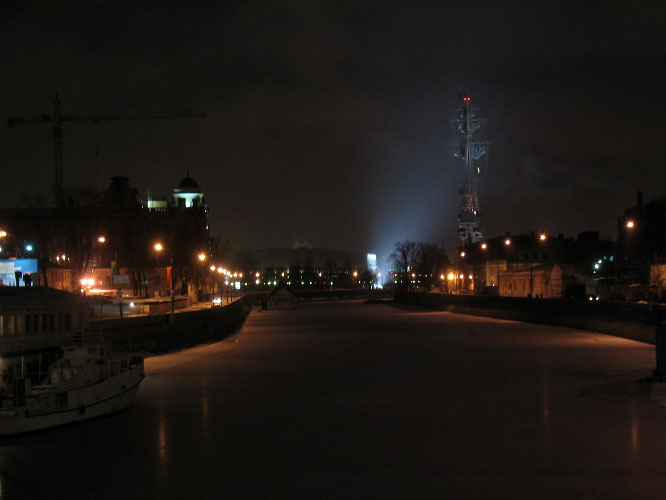 A giant monument to Peter the Great, built in the 1990s, dominates the southern end of a small island formed by a split in the Moscow River.