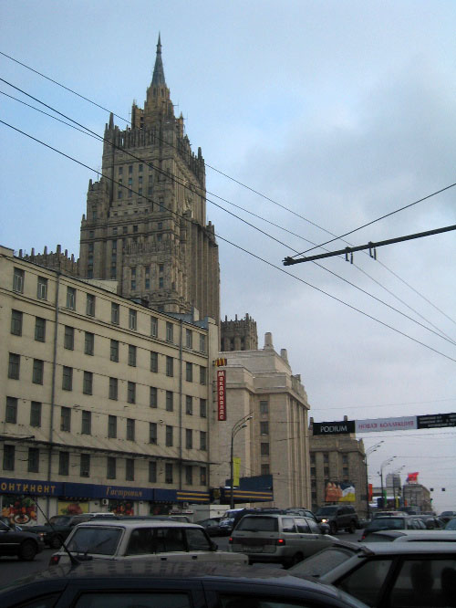 The ministry of foreign affairs, another of Stalin's seven sisters, at the bottom end of the pedestrianised street Arbat, with a modern addition on the corner, a McDonald's.