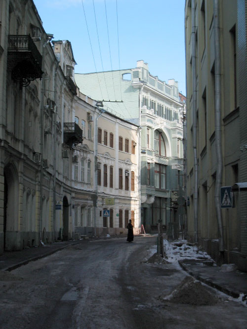 A priest taking a look at the restoration work on his tiny church with a very long name, the Cathedral of Saints Kostya and Damian in the Old Pan. It was covered in scaffolding.