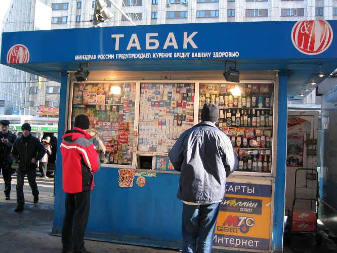 In the streets around Oktyabrskaya - it's so cold that this and all other Tabaks communicate with the rest of the world only through the tiny window in the center - the rest of the window space displays their wares. Plenty of cheap alcohol... |