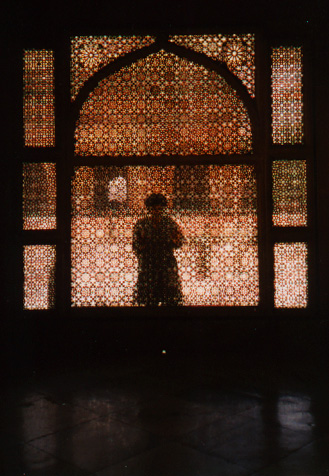 The view through a veil of solid stone in the mosque at Fatepur (sp) Sikri.