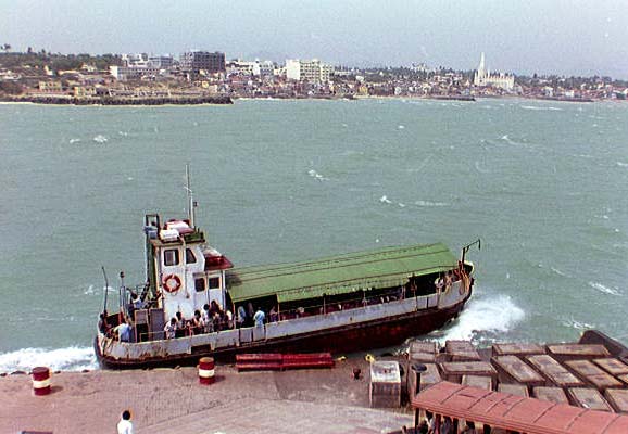 Facing north towards Kanniyakumari from the island monument to Swami Vivekandas, with the ferry leaving the dock. Doesn't quite meet Coast Guard regulations, does it?