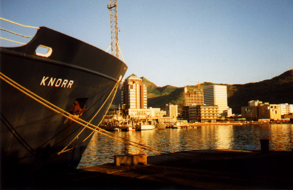 Sunset over Port-Louis, Mauritius, with the R/V Knorr tied up, set to sail in the morning.