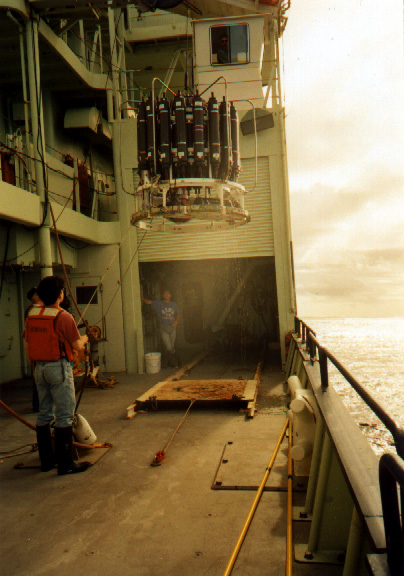 One of my jobs, retrieving the rosette, which samples ocean water at set depths with 36 Nansen bottles, and housed a CTD (measuring temperature and salinity with depth) and a lowered ADCP (acoustic doppler current profiler). |