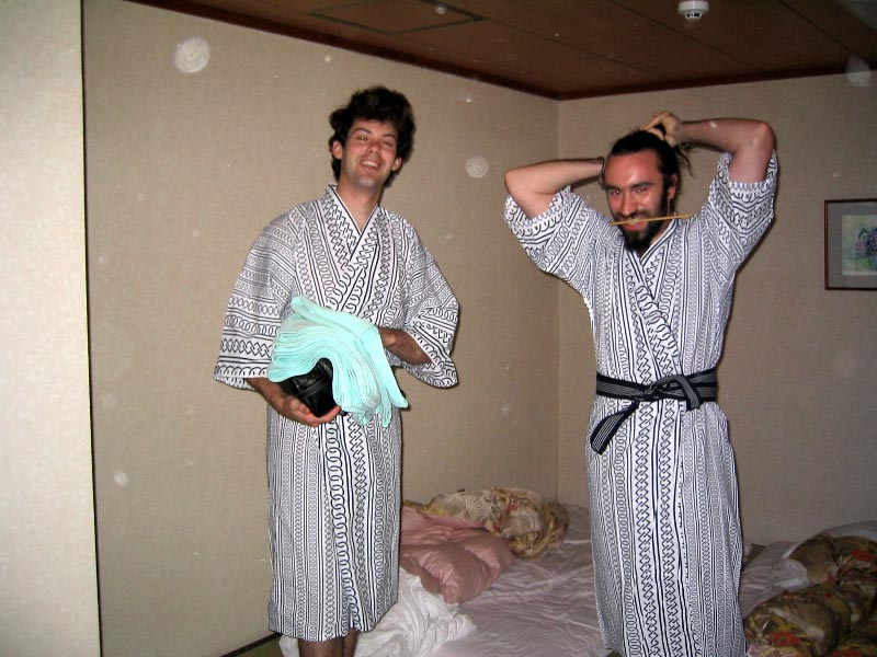 Sébastien, Matthieu, and I stayed in a Japanese-style hotel in Sapporo: off to the baths in our yukatas.