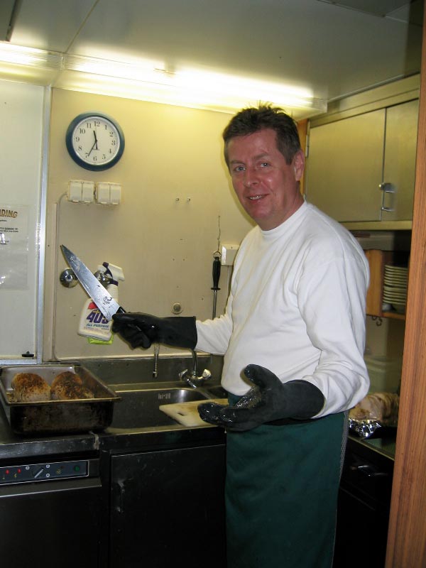 The cook was happy to introduce me to Icelandic cuisine, which featured fish, potatoes... and yet more fish. Fish every day for lunch, often with a sauce of mör, or sheep's tallow (tastes much better than it sounds). Breakfast was pretty Scandinavian, with bread and different kinds of meat, fish, cheese and eggs, and dinner was often lamb, an Icelandic specialty, and quite tasty. Saturdays, unfortunately, another kind of Icelandic specialty was served, a putrefied fish that's prepared by taking skate, raw, and burying it in salt in warm weather for several months. It is truly an acquired taste - to me the scent and flavor of ammonia overwhelmed anything else. Oof. But I did acquire a taste for kleinur, a kind of not-so-sweet Icelandic donut, the dark brown bread rugbröd, and the Icelandic lamb. |