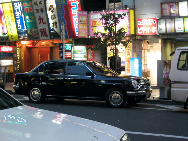 A classic old Toyota, a baddie's car, being guarded in a no-parking zone.